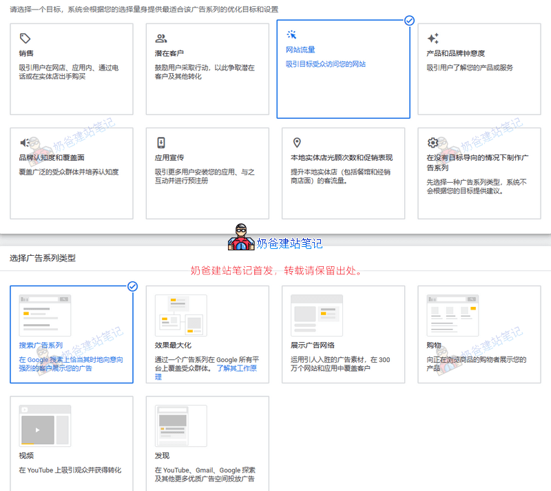 点击“新广告系列”按钮之后,会出现目标选择界面。这里以“网站流量”为例,选择网站流量之后,会出现广告系列类型,如下图: