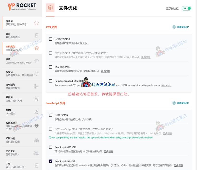 WP Rocket的设置并不复杂,基本上默认的设置就可以了,其中最主要的一点就是开启了资源合并之后,记得去网站前台多测试几个页面和功能,看看是否合并了会引起网页错误。