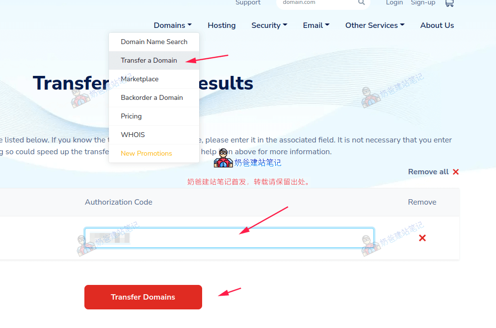 然后在出现的页面搜索框里面填写上你需要转入的域名,点击Transfer Domains按钮。