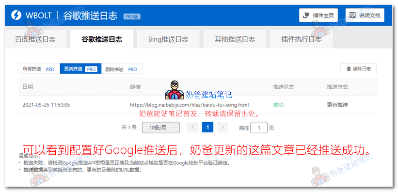 设置完毕之后,当我们发表文章,插件就会自动通知你设置了的搜索引擎,并且可以看到推送日志。