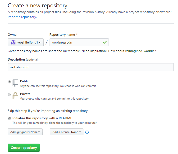 2.新建Github仓库,Repository name:输入仓库名称,然后点击「Create repository」开始创建。