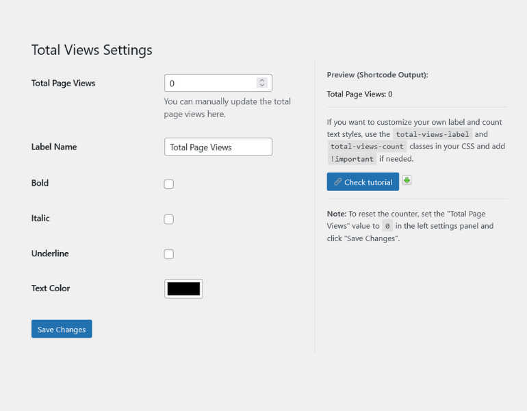 计数总页面浏览量为您的网站。 使用显示总视图可定制标签. 样式选项:粗体、Italian、underline、颜色. 可编辑总页面浏览量设置中的数字要手动调整。 前端短码[total_views]与管理预览中的相同地显示计数器。 CSS类:total-views-label和total-views-count用于高级造型。 任择“检查教程”按钮链接到视频指南。 响应式管理设置页面。非常适合想要的博主、开发人员和网站所有者快速交通洞察最小的设置。