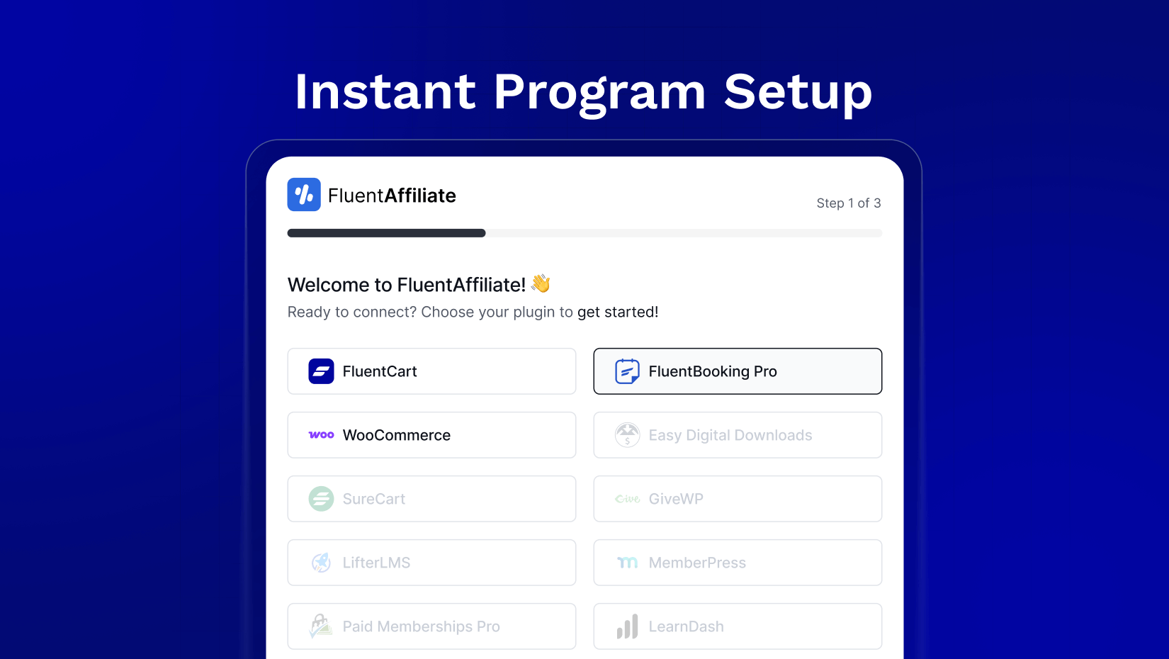 FluentAffiliate带有内置的设置向导,可引导您完成整个配置过程。您将能够快速、自信地设置您的联盟计划-无需任何技术技能。