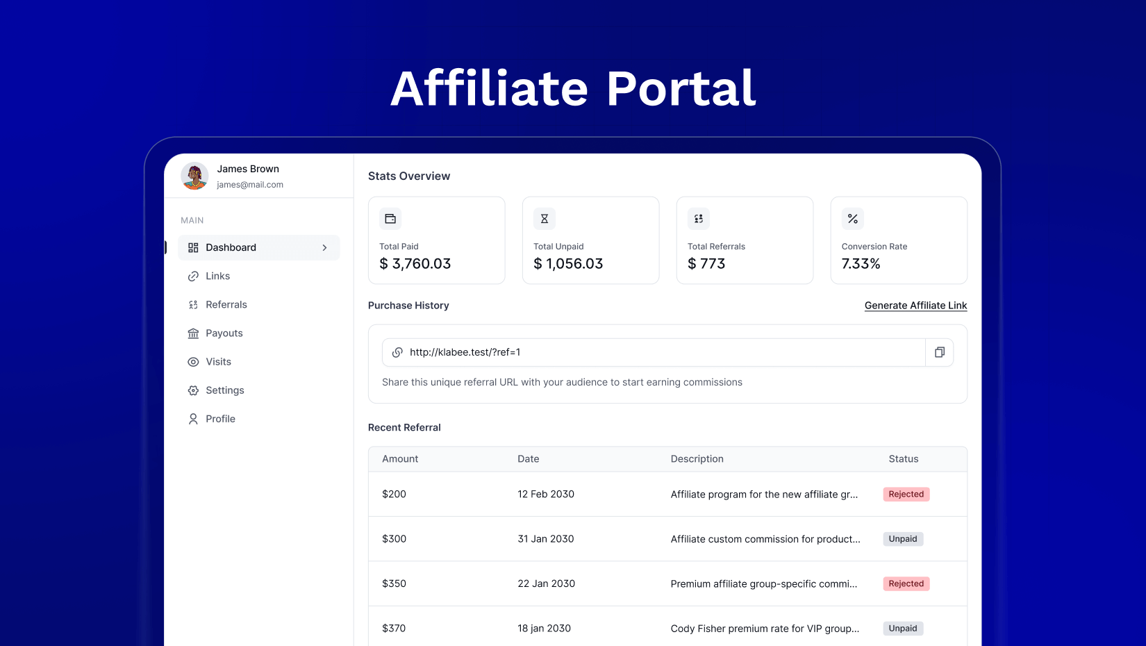 为您的附属公司提供一个功能齐全的门户,他们可以在其中管理其链接、查看收益并保持更新-所有这些都无需直接联系您。