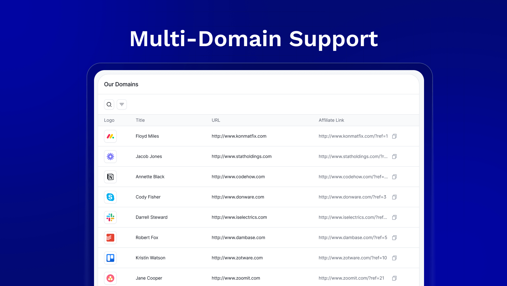 在单个FluentAffiliate安装下管理跨多个域的联属活动。保持一切井然有序并准确跟踪推荐。