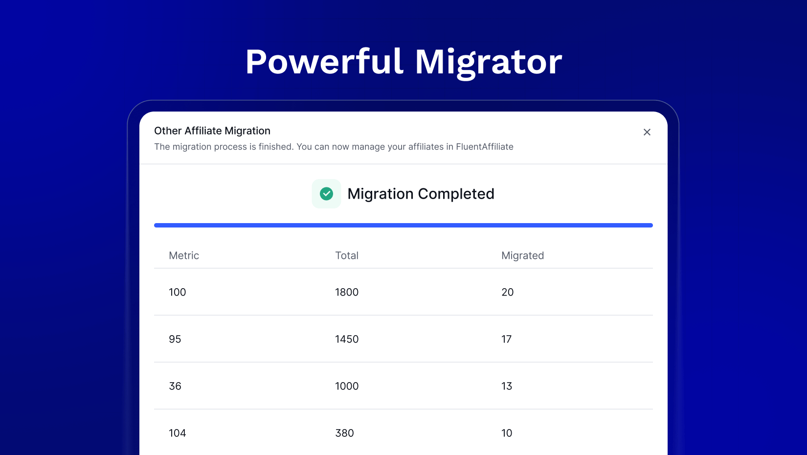 从AffiliateWP等另一个联属插件轻松切换到FluentAffiliate。我们的一键迁移器可以安全、顺利地移动您的所有数据。