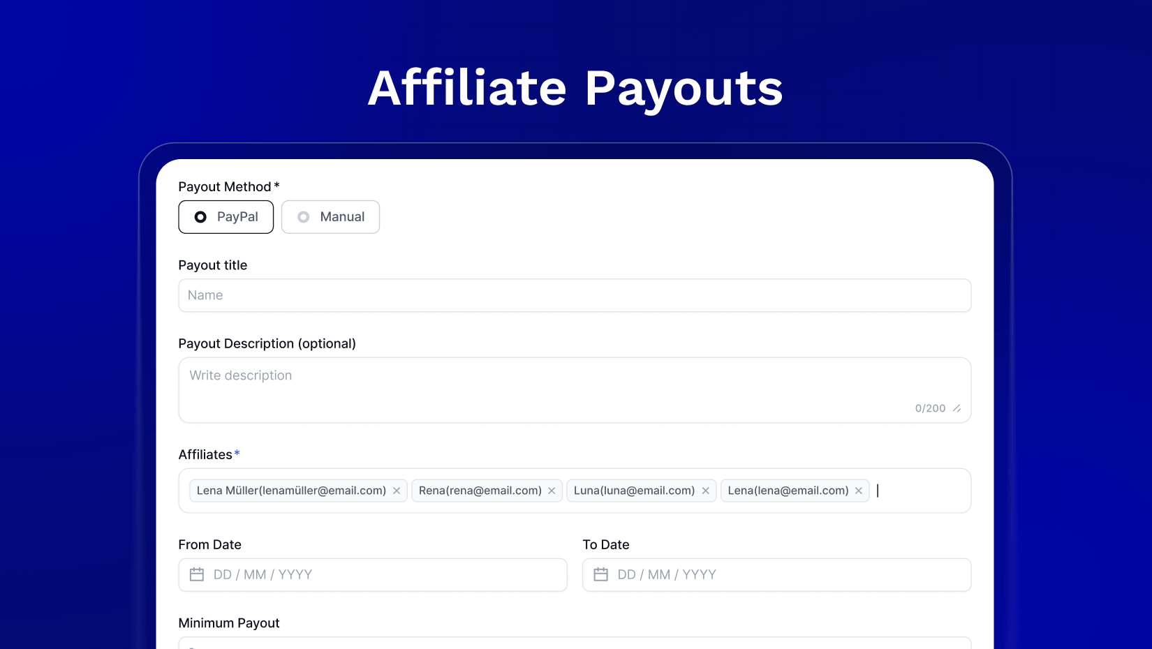 FluentAffiliate允许您添加和管理无限制的附属机构,没有任何限制。无论您是从小做起还是大规模扩张,您都不必担心达到限额或支付额外费用。