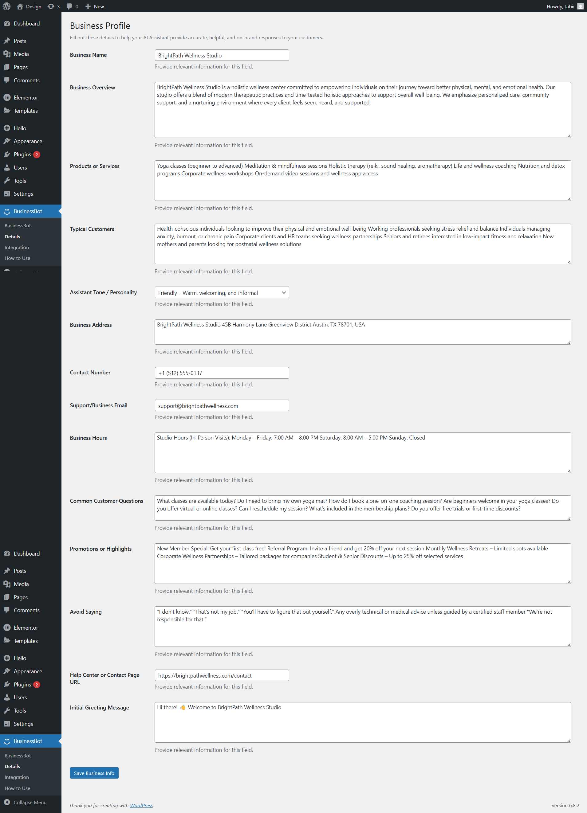 人工智能业务助理是一个用于WordPress的个性化BusinessBot AI聊天助理插件,可以像您网站上的实时支持主管一样。它使用Google Gemini AI根据您在管理面板中提供的信息了解您的业务。