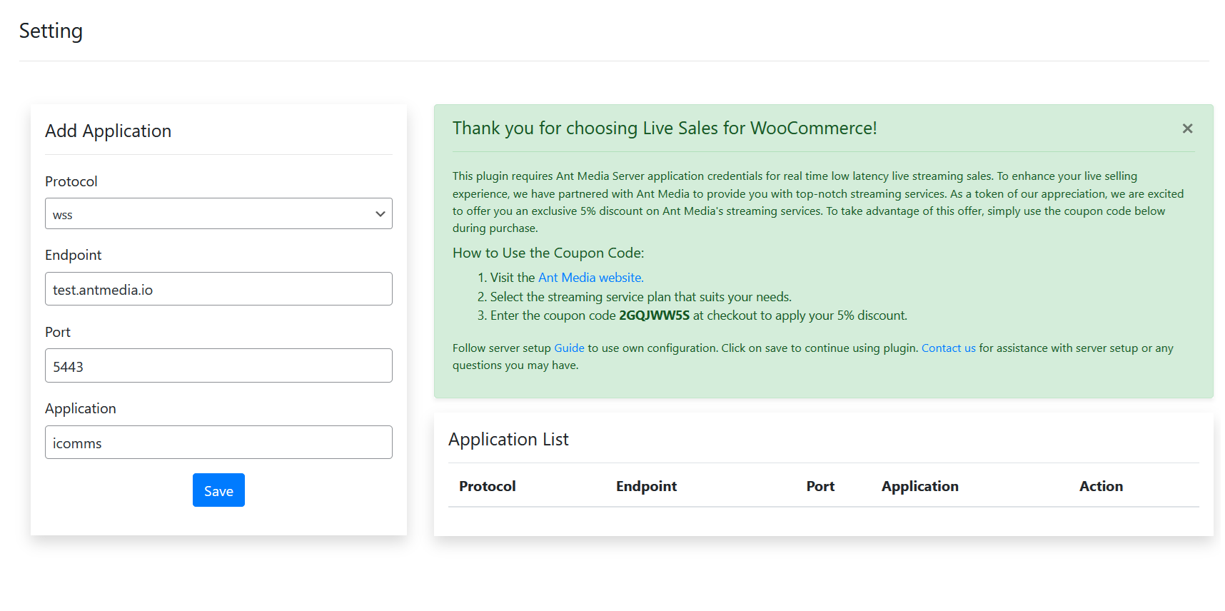 目录。WooCommerce已激活。如果没有,请安装woocommerce插件并通过wordpress中的-Plugins-菜单激活。通过WordPress中的-Plugins-菜单激活-Live Sales for WooCommerce-插件。转到设置页面并输入此处提到的antmedia服务器演示凭据。单击保存继续。前往安排菜单并安排现场销售的时间。在您希望观众观看现场销售流的任何页面上输入简短代码。单击“现场”开始现场销售。常见问题解答这需要安装woocommerce是的
