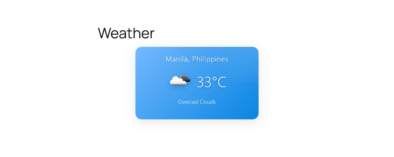 city string (default: Empty or Set in settings) City name for weather data (e.g., "London, UK")api_key string (default: Empty or Set in settings) Your OpenWeatherMap API keyunits string (default: metric or Set in settings) Temperature units: `metric` (°C), `imperial` (°F), `standard` (K)language string (default: Auto-detected) Language code for weather descriptionsshow_description boolean (default: true or Set in settings) Display weather descriptionshow_humidity boolean (default: true or Set in settings) Display humidity informationhumidity_label string (default: "Humidity:" or Set in settings) Custom label for humidity displayshow_wind boolean (default: true or Set in settings) Display wind speed informationwind_label string (default: "Wind Speed:" or Set in settings) Custom label for wind speed displayclass string | Empty (default: Empty or Set in settings) Additional CSS classes for styling