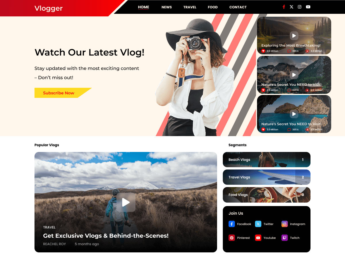 Professional Vlogger Theme是一款现代、时尚且功能丰富的解决方案,专为vlogger、YouTuber、内容创作者和视频博主打造。无论您是分享旅行冒险、美容教程、技术评论、生活方式提示、游戏流媒体、时尚运输还是烹饪视频,此主题都提供了您所需的一切,以干净、专业且视觉吸引力的形式展示您的视频内容。它采用响应灵敏且视网膜就绪的布局设计,可确保您的视频和帖子看起来清晰,并在包括手机、平板电脑和台式机在内的所有设备上完美地表现。其用户友好的界面和直观的导航使访问者能够轻松浏览内容,而主页具有动态视频滑动器或特色内容部分,可以突出显示您最新或最受欢迎的上传内容。专为多媒体量身定制的有组织的类别、标签和帖子格式可提供流畅的内容管理,而专门的订阅区域和行动号召(MTA)部分则有助于扩大您的受众。社交媒体集成与YouTube、Instagram、TikTok和Facebook等平台无缝连接,提高影响力和参与度。该主题是SEO友好的,针对速度进行了优化,并使用干净的代码构建,确保更高的搜索引擎排名。字体、颜色和布局的定制选项可让您的个人品牌大放异彩,适合生活方式视频博主、旅行视频博主、美容影响者、技术评论家、数字创作者和媒体影响者。 这包括视频博客、内容创作者网站、YouTube视频展示、生活方式vlog布局、旅游视频博客、技术评论员模板、美容影响者主题、数字创作者平台、媒体影响者网站、社交视频频道、游戏vlog网站和在线视频组合。对于高级视频嵌入、播放列表创建和视频库管理,与Embed Plus for YouTube插件的集成提供了为专业视频创作者量身定制的强大功能。https://preview.wpradiant.net/professional-vlogger/