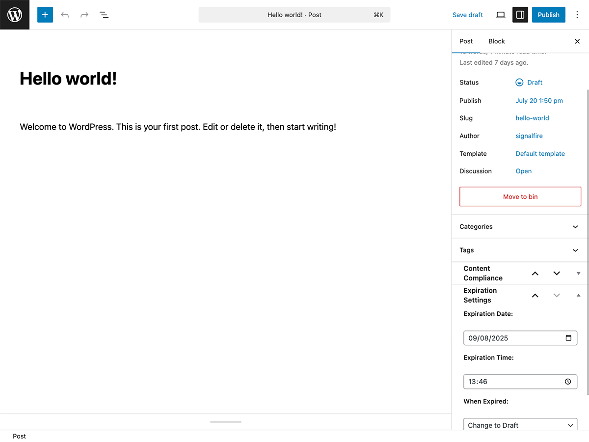 Signalfire Expire Content允许您设置WordPress帖子和页面的到期日期和时间。内容过期时,您可以选择自动将其更改为草稿状态或将访问者重定向到自定义URL。