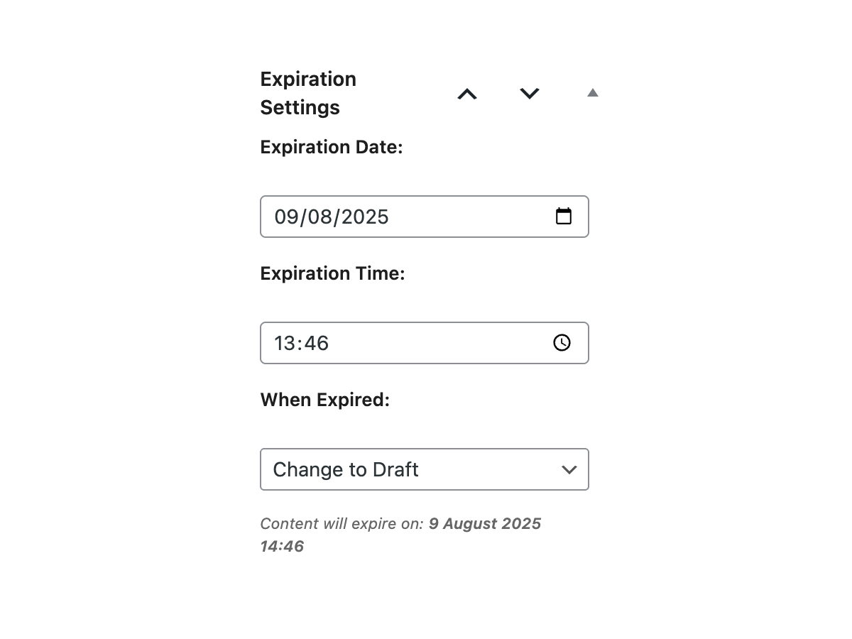 目录,或者直接通过WordPress插件屏幕安装插件。通过WordPress中的-Plugins-屏幕激活插件。编辑帖子或页面时,您会在侧边栏中看到-DeliverSettings- metabox。设置您所需的到期日期、时间和操作。常见问题解答:内容到期时会发生什么?您可以在两种操作之间进行选择: