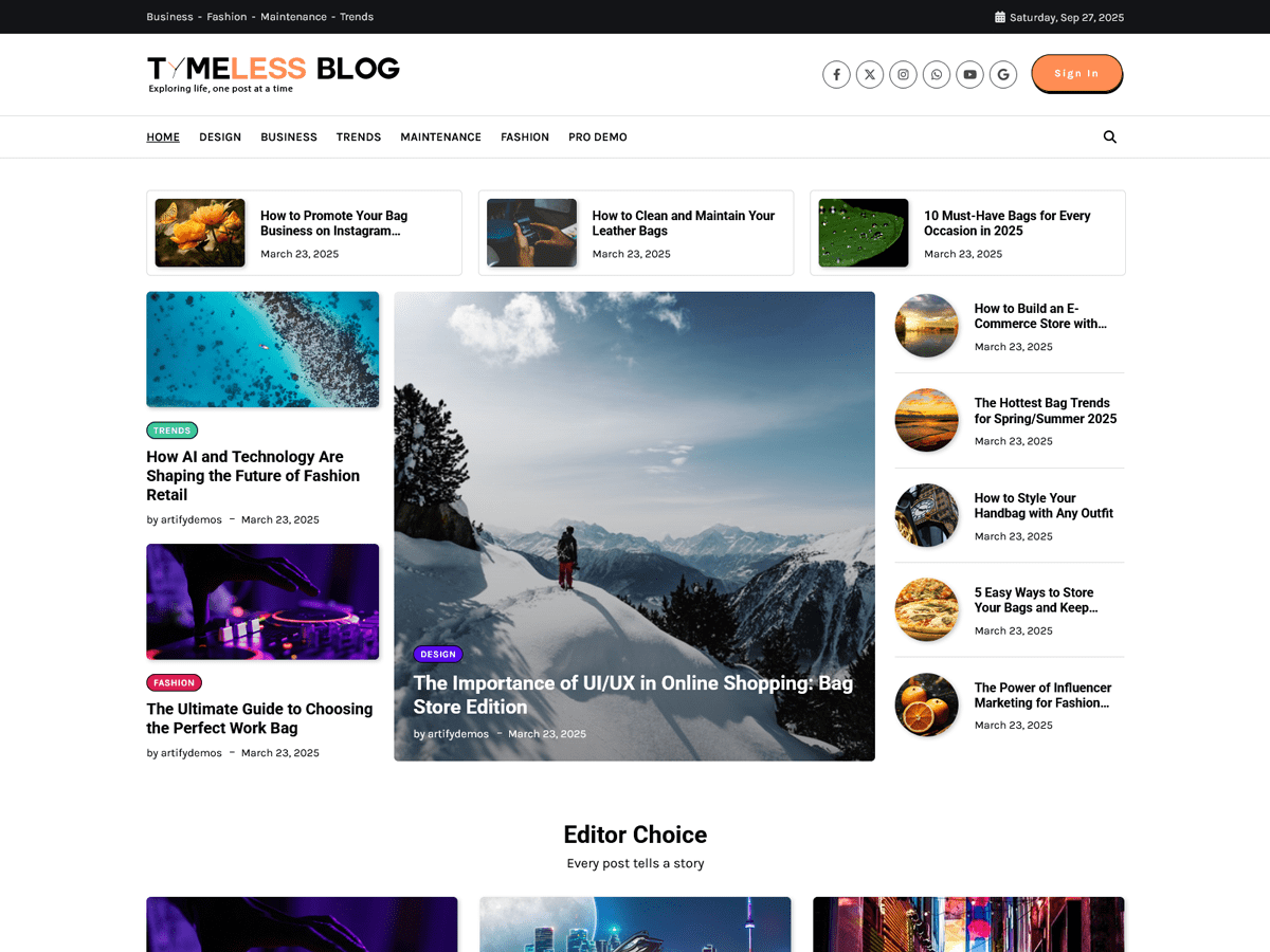 Timeless博客是一个现代、轻量级、完全可定制的WordPress主题,专为专业博主打造。无论您是分享时尚、生活方式、旅行、美食还是摄影内容,此主题都能在任何设备上提供惊人的性能、完整的响应能力和无缝访问能力。它经过移动优化、跨浏览器兼容且易于描述,可以轻松构建一个独特且引人入胜的脱颖而出的博客。生活