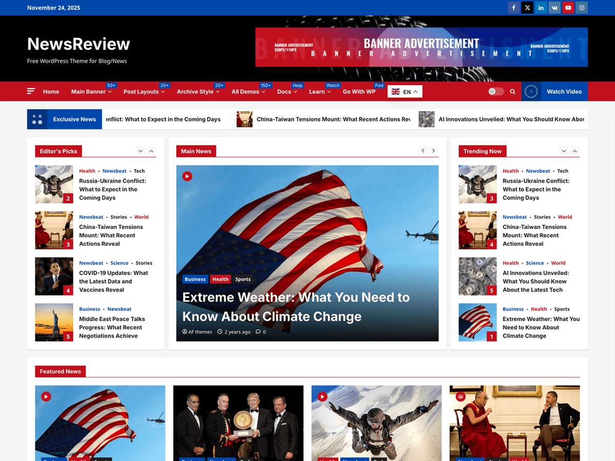 NewsReview是一个免费,快速,轻量级,完全响应的WordPress主题,专为新闻网站,在线杂志,个人博客,企业网站,电子商务商店,投资组合,教育门户网站和非营利组织设计。它建立在强大的ReviewNews主题之上,提供了一个与Gutenberg、Elementor、Divi、Brizy和其他流行的页面构建器兼容的拖放式Header Footer Builder,使您无需编码即可轻松创建专业、现代的布局。NewsReport具有50多个即可导入的入门网站、30多个自定义小部件、先进的块模式、灵活的布局、MP支持和完整的WooCommerce集成,确保快速页面加载、出色的核心Web重要信息、移动友好的设计和顶级的Google PageSpeed性能。它采用干净、轻量级的代码、SEO优化、WMAG可访问性、GDPR合规性和多语言+ RTL支持开发,包括英语、西班牙语、德语、法语、日语、中文和阿拉伯语的演示内容,非常适合寻求免费、可扩展、专业和面向未来的WordPress主题的出版商、博主、记者、企业和创作者。作为新闻主题、杂志主题、博客主题或企业WordPress模板,NewsReport结合了速度、风格、灵活性和SEO友好的设计,适合任何网站。浏览https://afthemes.com/products/newsreview/的所有功能