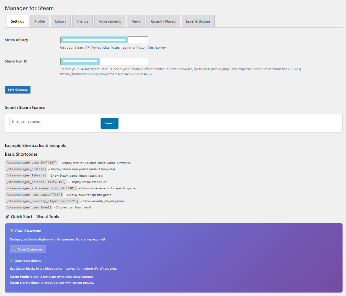 Manager for Steam v2.1.1是一个全面的WordPress插件,提供完整的Steam集成,具有高级视觉定制功能、古腾堡区块支持和智能缓存以实现最佳性能。