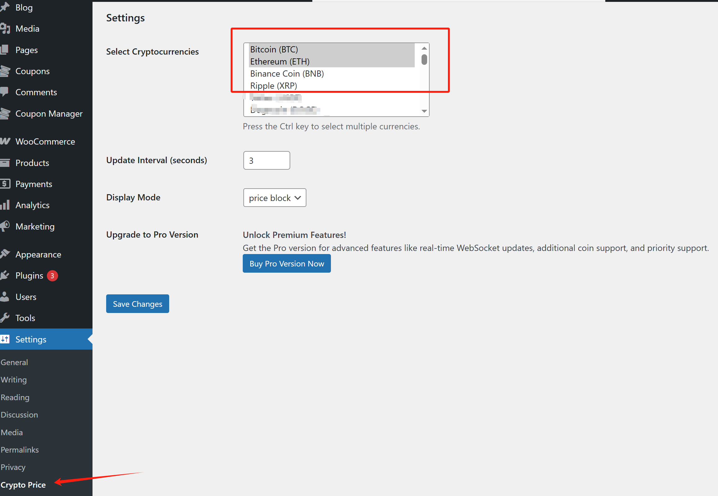 在你的WordPress管理员。在配置页面中,选择要显示和保存更改的加密货币。