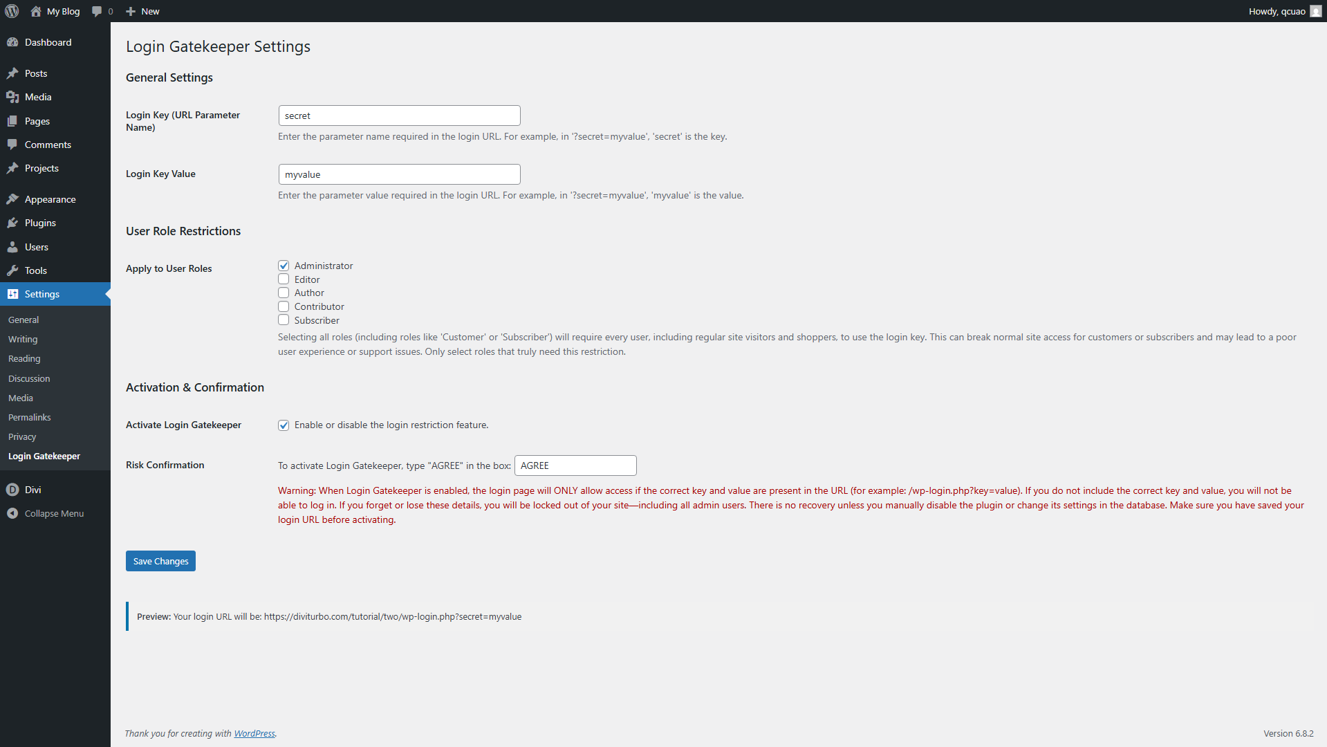 从WordPress管理员设置页面轻松配置您的登录密钥、值和限制角色。该插件还包括风险确认步骤,以防止意外锁定。