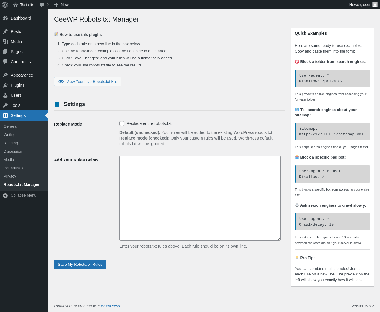 访问设置Robots. url管理器以开始添加您的自定义规则。该插件包含有用的示例,可让您快速入门。
