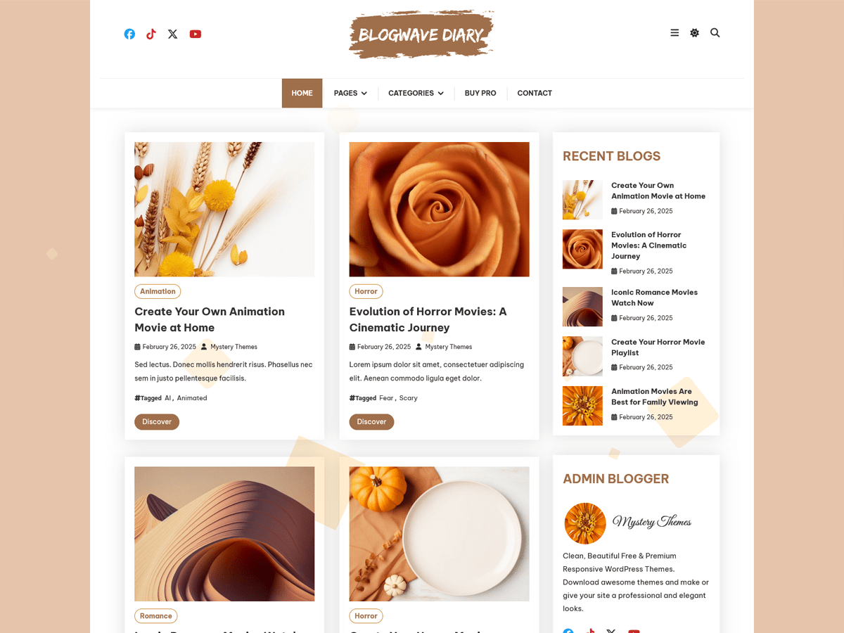 Blogwave Diary是一个迷人的WordPress主题,专为喜欢简单与时尚相结合的博主设计。其干净优雅的布局使其成为分享您的创意想法、个人故事和生活小冒险的理想空间。此外,它响应灵敏且适合移动设备,因此您的读者无论使用什么设备,都可以享受流畅的体验。