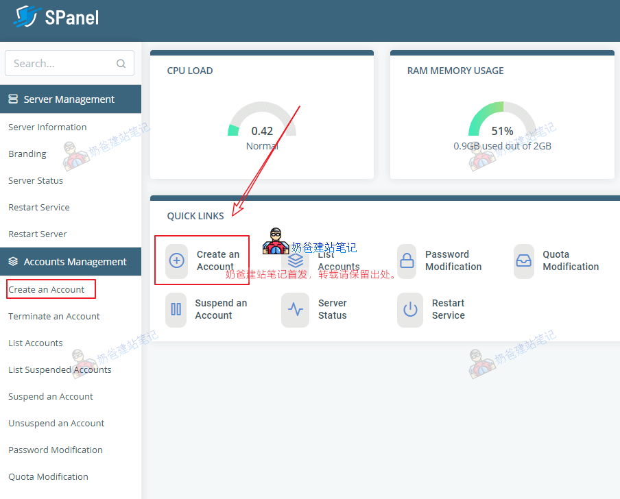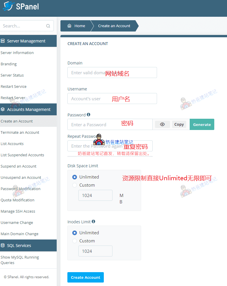 10、登录Spanel面板创建网站账号