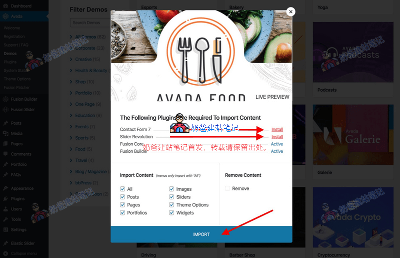Avada导入演示数据的时候没有单独页面导入可选,只能一次性导入整个演示数据。