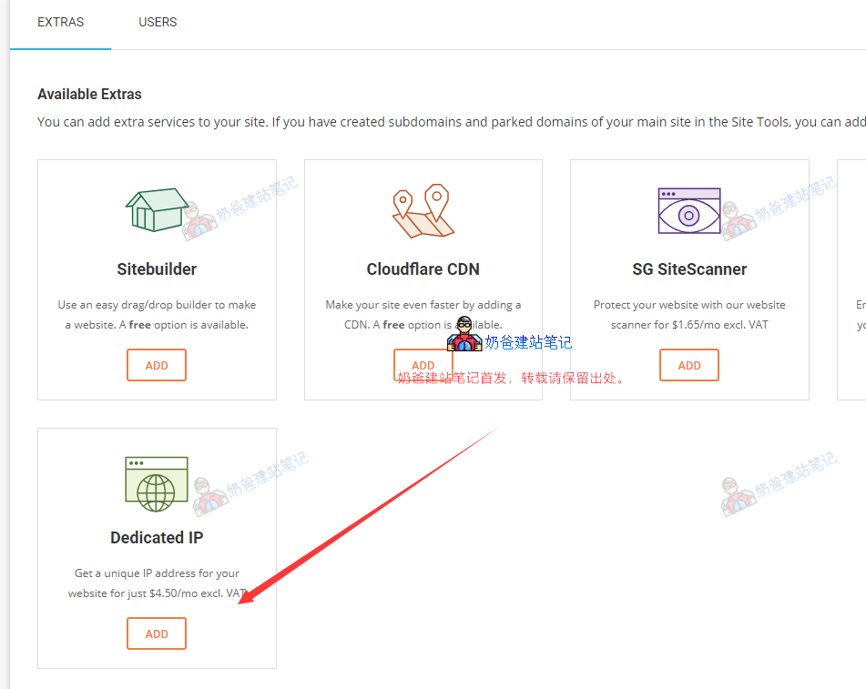 如果你是新版本SiteGround后台,订购独立IP的按钮在后台首页下方,直接点击ADD按钮就可以添加上。