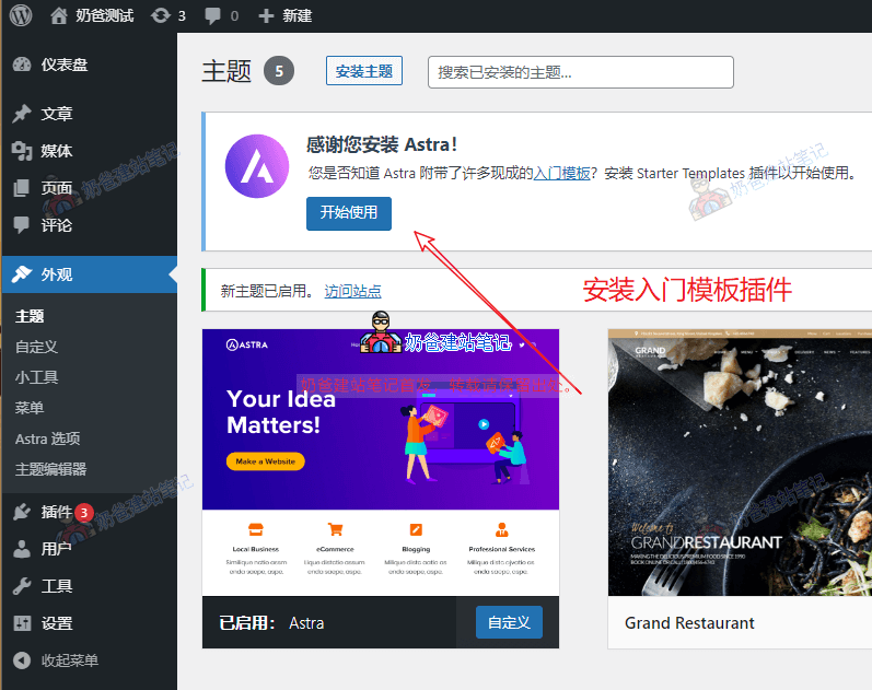 2、安装 后启用主题,会提示你安装Starter Templates 插件。